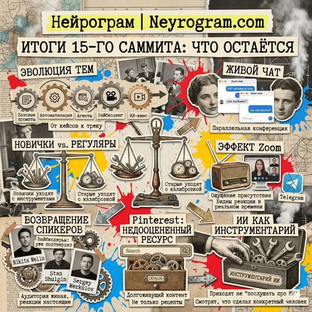 Большинство конференций по ИИ проходят раз в год. У нас по-другому. Нейросаммиты идут каждый месяц уже больше года. К 15-му саммиту аудитория прокачалась настолько, что один из участников написал в чат: "Закалённые в 14 саммитах". И это не метафора.