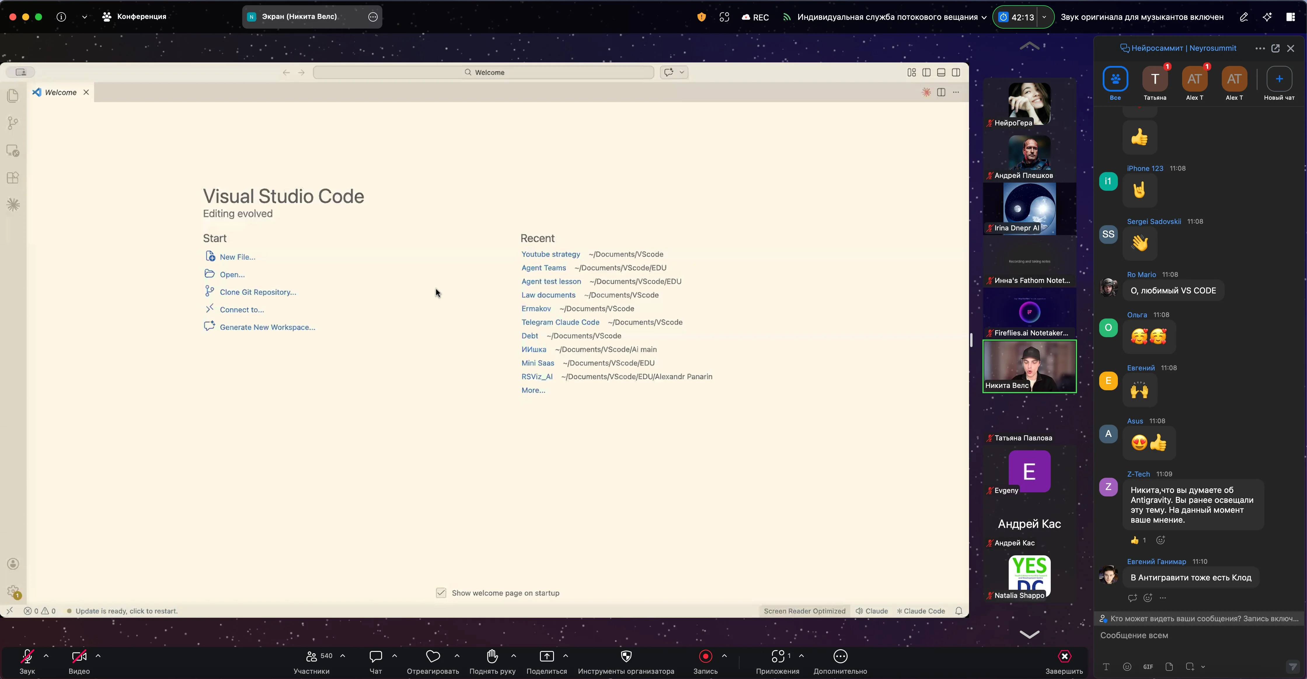 Живой чат это отдельный контент. Пока Никита Велс показывает Claude Code, 500 человек в чате обмениваются опытом: кто уже пробовал, что не сработало, как настроили у себя. Это параллельная конференция внутри конференции. Такое не бывает в записи.
